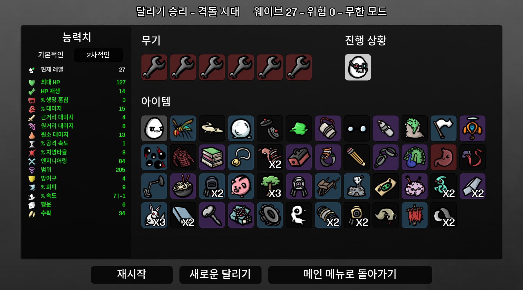 - 보스: 흡혈·재생+넉백·관통 조합으로 안정성 확보