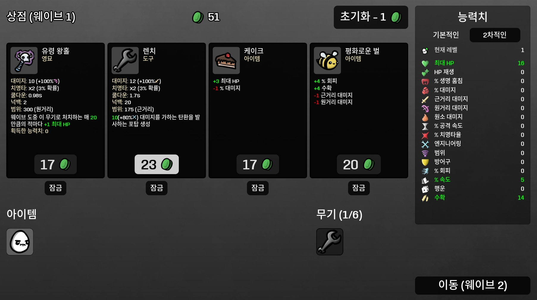 - 생존: 초반 이속/회피/체력 1~2회 확보 권장